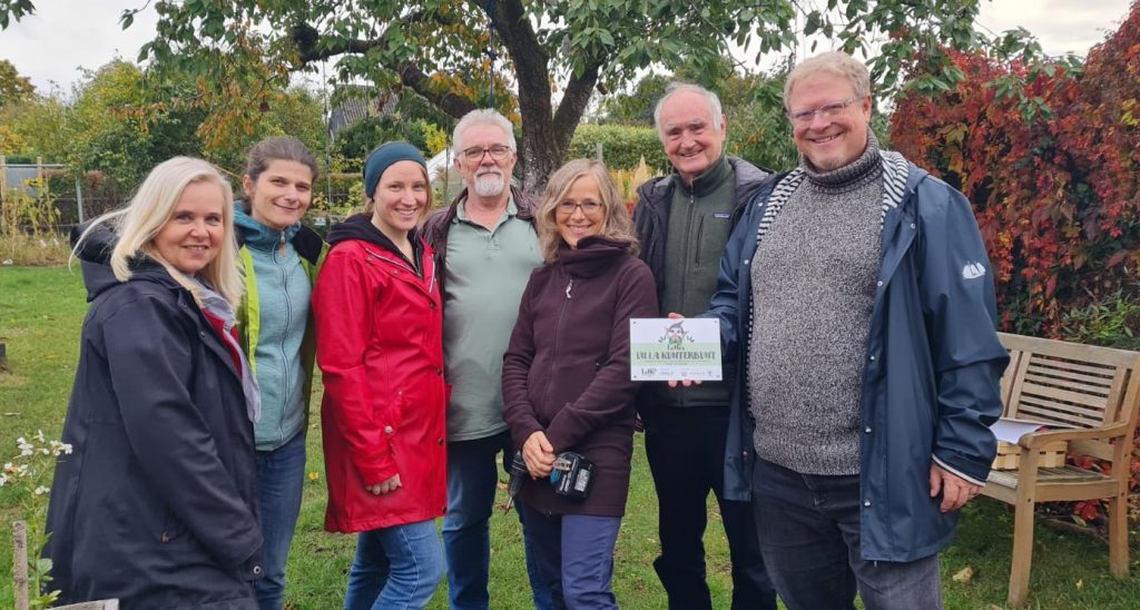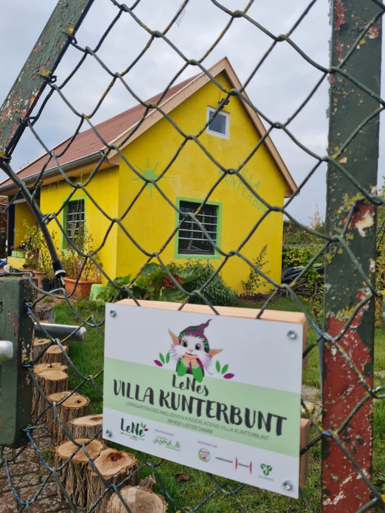 Alle haben sich Zeit genommen, an diesem sonnigen Herbsttag im Oktober: die Schreberjugend Niedersachsen, der KGV Lister Damm, der Inklusive Kinderladen Villa Kunterbunt, der Bezirksrat Vahrenwald-List und das Präsidium des BZV Hannover. Neben der wunderbaren Gelegenheit, sich wieder einmal sehen und austauschen zu können, freuen sich alle, dabei zu sein: beim feierlichen Aufhängen des ersten Pfortenschildes für einen unserer Lerngarten: für LeNes Villa Kunterbunt.
