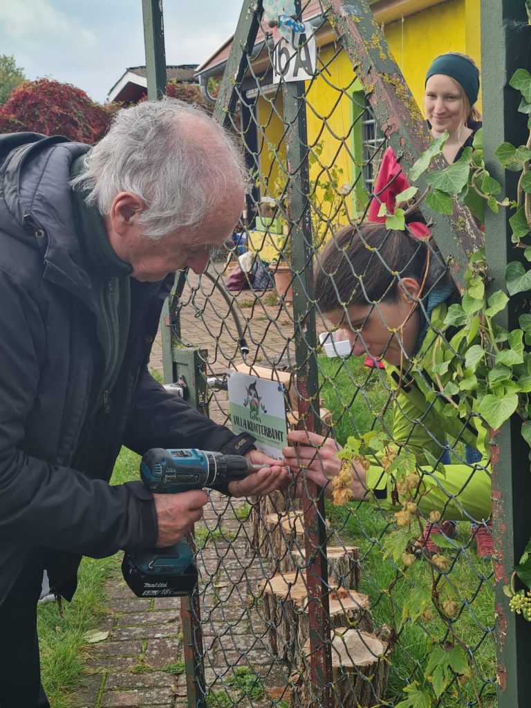 Als BZV-Präsdident Reinhard Martinsen, Fachberaterin Kati aus dem KGV Lister Damm und Rebecca Alles aus dem Inklusiven Kila gemeinsam mit Akkuschrauber und Kantenhölzern zur Tat schreiten, achten sie genau darauf, dass sie das Schild in Augenhöhe platzieren. Ja klar, das Pfortenschild ist dazu gedacht, dass interessierte Gartenfreunde sowohl beim Vorbeilaufen, als auch beim Eintritt in den Garten sofort begreifen, dass sich hinter der Pforte ein besonderer Garten verbirgt. Doch allem voran soll das Schild, auf dem LeNes Kobold freudig über dem Namen lehnt, die Kinder bei ihren Gartenbesuchen gleich an der Pforte willkommen heißen.